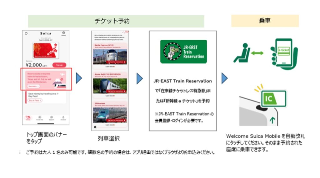 JR 東日本では、 10 月1日に訪日外国人向けアプリ「Welcome Suica Mobile」と「JR-EAST Train Reservation」との連携を開始する。アプリの専用リンクより、訪日外国人に需要の高い「成田エクスプレス」や「富士回遊」をはじめとする在来線特急列車や、東北・北海道、秋田、山形、上越、北陸の各新幹線の指定席特急券をスムーズに予約し、チケットレスでご乗車できるようにする。