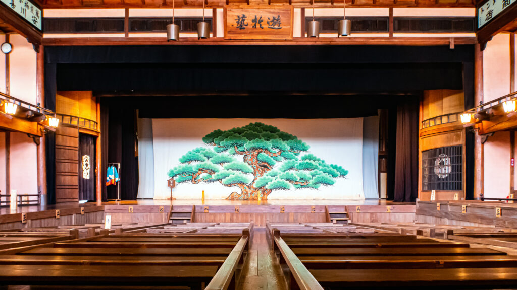 このあでやかな芝居小屋の近隣には、重要伝統的建造物群保存地区である八日市護国が、南北に約600mの小道を作っている。地中埋設された電線によって空が広い。そのため、町家や豪商の屋敷などが連なる姿は、古き時代へいざなってくれる。