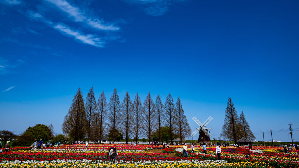 ビビットなチューリップと風車のある景色は、どこかの海外の風景かと見間違えてしまう。しかし、ここは、都内から電車とバスに乗って約1時間の場所である。どこから仕入れた情報なのか、最寄駅の路線バスは、日本人よりも外国人の方がたくさん乗っている。