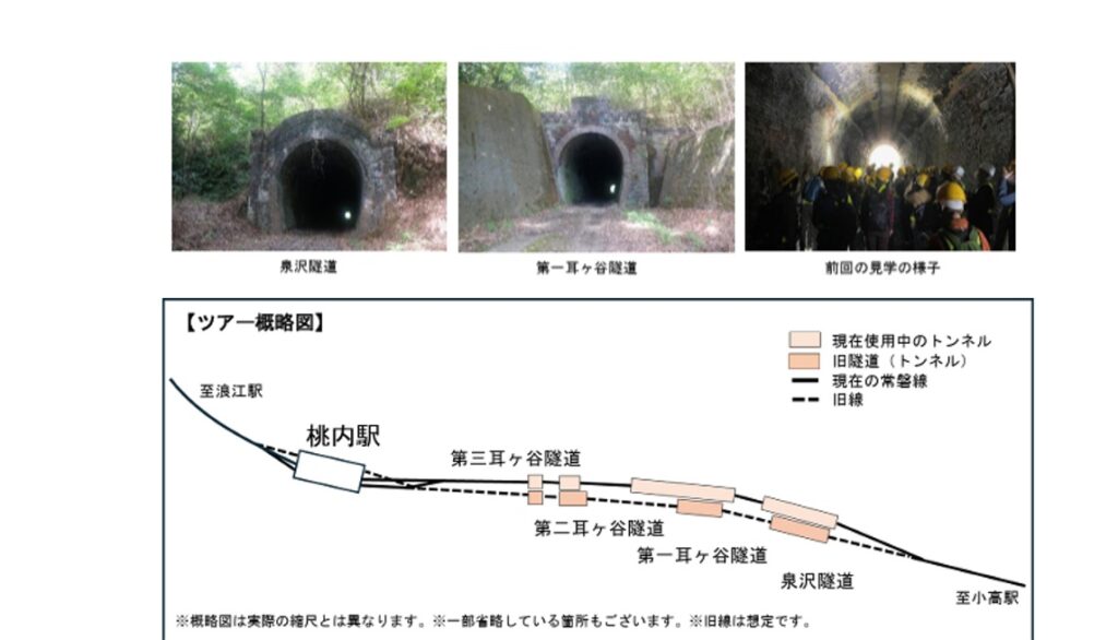 行程 桃内駅集合・受付 桃内駅出発 = 第二耳ヶ谷隧道見学 = 第三耳ヶ谷隧道見学 = 第一耳ヶ谷隧道見学 = 泉沢隧道見学 桃内駅解散 。