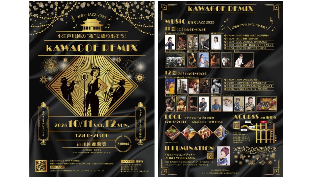 10月11日・12日の両日、川越市の蓮馨寺境内で、KAWAGOE LIVE(カワゴエライブ:お寺でジャズ)が開催される。小江戸川越ライトアップ(蓮馨寺イルミネーション)、食のイベント(キッチンカー & グルメ屋台)など盛りだくさん。入場無料 小雨決行 荒天中止。