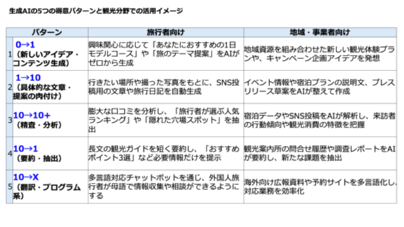 これらの事例は、AIの活用シーンが多様に広がっている中で、「旅行者向け」と「観光地域・観光事業者向け」で大きく異なることを示しています。旅行者向けには「新たな体験価値の創出」や「利便性の向上」が、観光地域・事業者向けには「マーケティングの高度化」や「業務効率化」が主な目的となります。今後AIを活用する際には、「誰が、何のために使うか」を明確にすることが重要です。生成AIには、大きく分けて5つの得意なパターンがあります。ゼロから企画案などを生み出す「0→1(アイデア生成)」、SNS投稿文などを作成する「1→10(肉付け)」、膨大なクチコミを解析する「10→10+(分析)」、長文から要点を抜き出す「10→1(要約)」、そして多言語対応などを担う「10→X(翻訳・応用)」です。