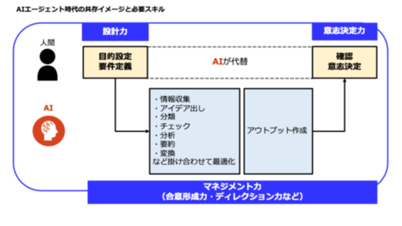 今後は、AIがさらに進化し、自律的に業務を進める「AIエージェント」が台頭します。これは、指示された単一の作業をこなすだけでなく、「福岡旅行を3泊4日で計画して予約までして」といった曖昧な依頼に対し、自ら情報収集、比較検討、予約までの一連のタスクをこなしてくれる、まさに”デジタルの代理人”です。このような時代が訪れると、情報収集からアウトプット作成までの実行部分は、ほぼAIが代替するようになるでしょう。その時、私たち人間に求められるスキルは大きく変化します。