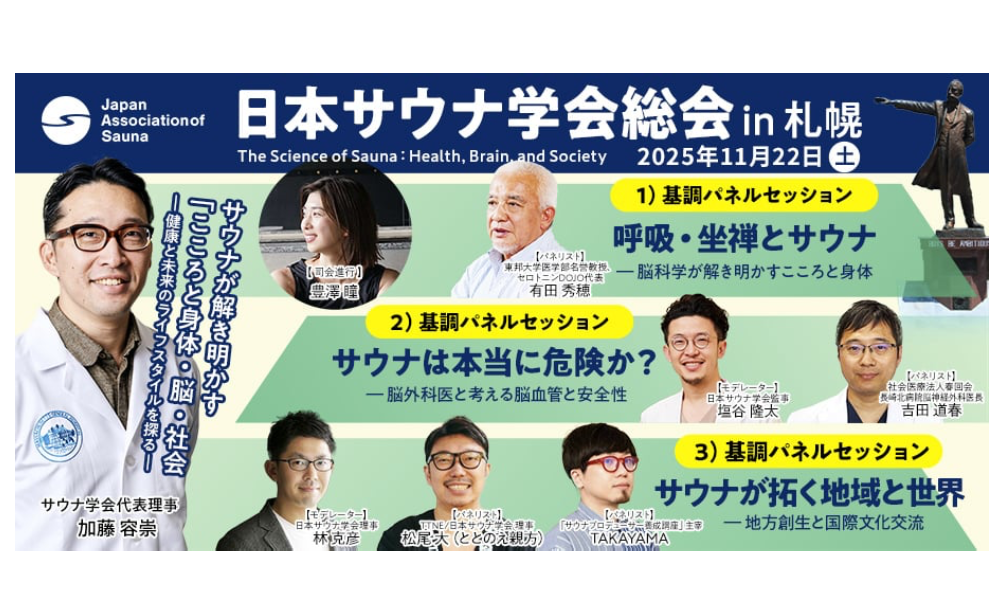 日本サウナ学会は、2025年度の総会を11月22日に札幌市東区の「EZOHUB SAPPORO」で開く。テーマは「The Science of Sauna:Health, Brain, and Society」。サウナが心身や脳、社会にもたらす影響を科学的に捉え、健康と未来のライフスタイルを探る。オンラインでのも参加できる。