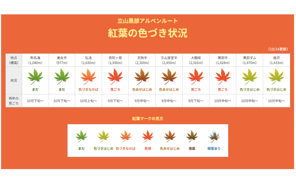 今年は数十年ぶりの鮮やかな色づきとなっており、大観峰や黒部平では見頃が続く一方、室堂から天狗平にかけては紅葉のピークを過ぎつつあるという。