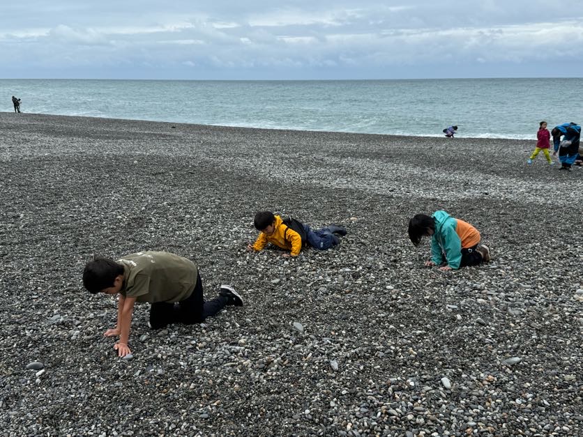 雨が上がった隙に、みんなの「もう一度石拾いがしたい!」という声に応え、予定にはなかった親不知海岸へ。昨日の経験と今朝の分類作業を経て、より岩石の違いが判るようになったみんなは短時間でしたが集中して岩石採集。