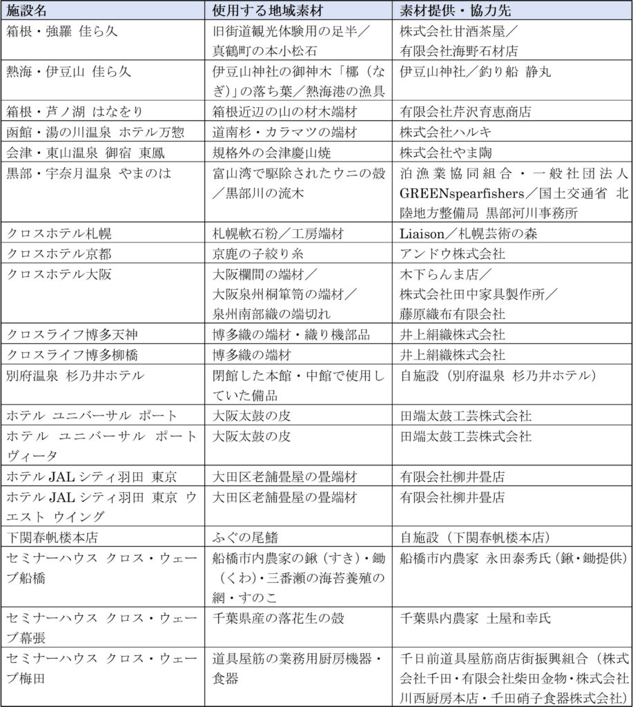 2年目となる今年は、目標12「つくる責任、つかう責任」の達成に向けた取り組みとして、「Make a circle!(メイク ア サークル)」をコンセプトに、地域の産業や工芸の過程で副次的に生じる素材や端材など、再利用可能な地域資源を用いたアート作品を制作。各施設の担当者が、素材の調査・選定を行い、地域の方々やアーティストの協力を得ながら、その土地ならではの魅力や文化を表現するアート作品を完成させている。作品は、11月から、各施設のロビーなどに展示される。アート作品を通して、地域の産業や工芸の魅力、その背景にあるストーリーを伝えるとともに、資源の循環利用やサステナブルな未来について考える機会を提供する。