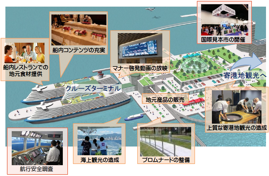 下関市の「下関港における新たな観光プログラム造成事業」は、寄港地観光の魅力を高めるための新たな観光コンテンツ開発を行う。北九州市の「受入体制強化とコンテンツ充実によるインバウンド層集客力強化事業」は、クルーズ旅客の利便性向上と満足度向上を目的とした取組を進める。