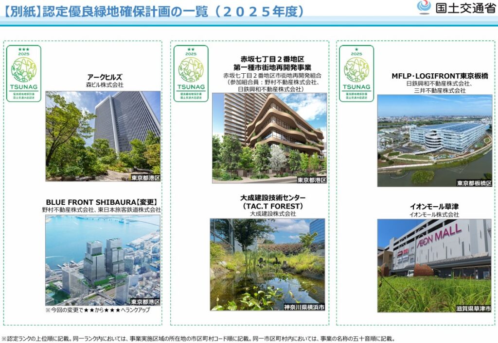 国交省では、「まちづくりGX」の一環として、2024年11月に施行された改正都市緑地法に基づき、優良緑地確保計画認定制度(TSUNAG:ツナグ)を創設。TSUNAGは、企業等による良質な緑地確保の取り組みを、気候変動対策・生物多様性の確保・ウェルビーイングの向上といった観点から、国土交通大臣が評価・認定する仕組みとなっている。