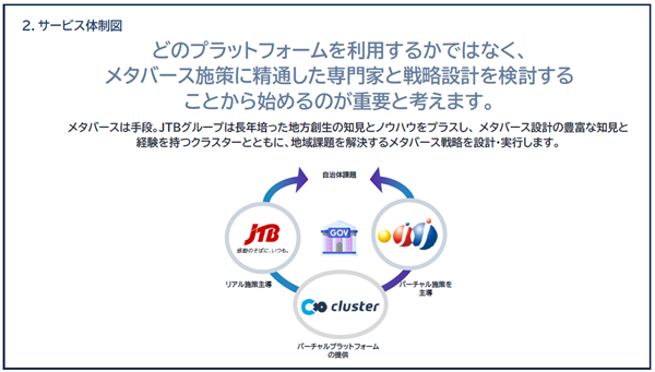 同サービスは単なる空間提供と異なり、JTBの自治体とのネットワークを生かし、バーチャルとリアルを掛け合わせた新たな交流のカタチを提案。課題を解決するトータルなソリューションサービスを提供していく。