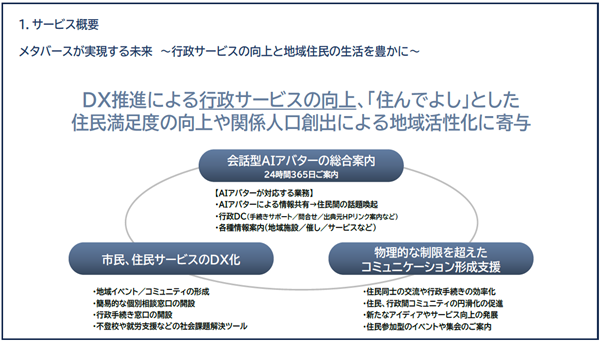 メタバース関連事業に取り組んでいない自治体向けに、多額の初期費用を必要としない基本空間を活用したトライアルプランを用意する。匿名性や時間、場所を選ばないメリットを生かし、地域住民の交流促進や不登校支援、既存のイベントや各種相談会をバーチャル空間で実施できる。