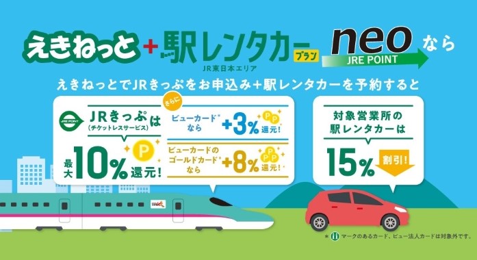 「えきねっと+駅レンタカープラン neo」は、JR東日本のインターネット予約サービス「えきねっと」でチケットレスの特急券を購入し、駅レンタカーを同プランで申し込むと、チケットレス商品の10~18%相当のJRE POINTが付与され、レンタカー料金も通常より15%割引となる。
