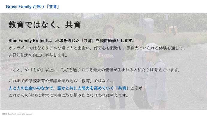 私がこれからも創り出してしていきたいのは、そんな「共育」=人と人が共に育つ新しい学びのかたちです。特に、子どもたちが地域の誰かに出会うことで、人生の記憶に残る体験をし、未来が楽しみになる選択肢や可能性が生まれること。そのための手段として日本各地の地域の人たちとの出会いをつないでいきます。それが、Grass Family.の目指す姿です。