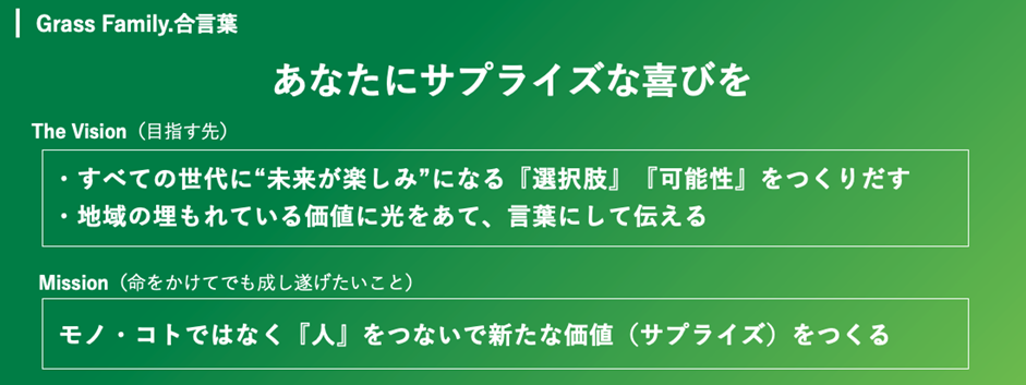 私が経営しているGrass Family.社が大事にしているMVVです。創業から2年半を経て、アップデートしました。
