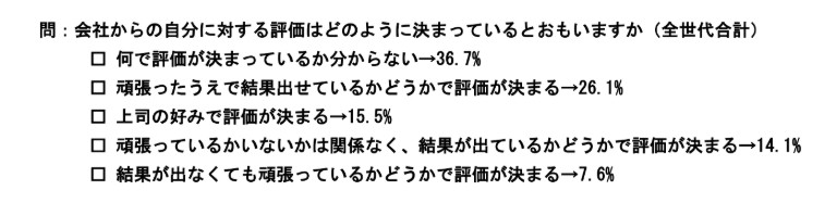 評価に関する以下の設問では、全世代において、「何で評価が決まっているか分からない」の回答が3割以上を占めた。「『自身がどういう評価をされているか分からない』ことが、成長を阻害する要因になっており、成長を実感しにくい環境を醸成する要素の一つになっている」と同社は話す。