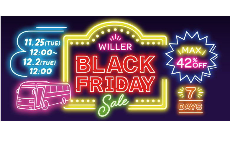 WILLER MARKETING(大阪市)は、予約サイト「WILLER TRAVEL」で、年末年始の帰省・旅行シーズンにあわせた「WILLER ブラックフライデーセール」を、11月25日正午から12月2日正午まで実施する。