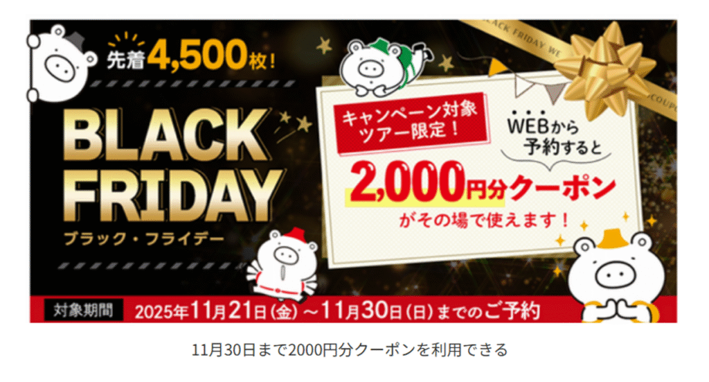 クラブツーリズム(酒井博社長、東京都江東区)は11月21日(金)~30日(日)まで、「ブラック・フライデーキャンペーン」を実施している。