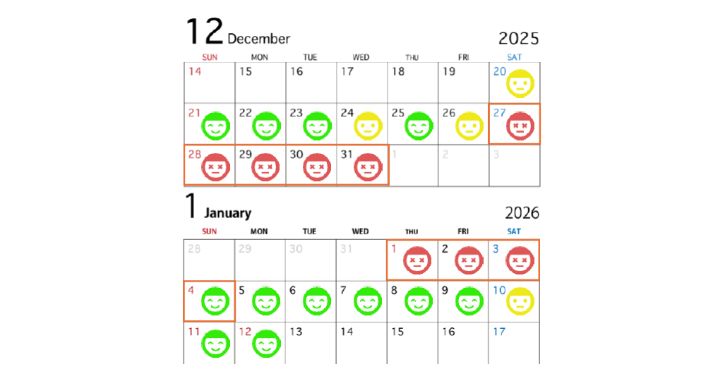 Hotels.comは11月25日、2025~26年の年末年始に向けた「穴場コスパ国内旅行先ランキング」や「人気旅行先ランキング」、さらに混雑日とお得な宿泊日の予測を発表した。(画像は宿泊費お得カレンダー)