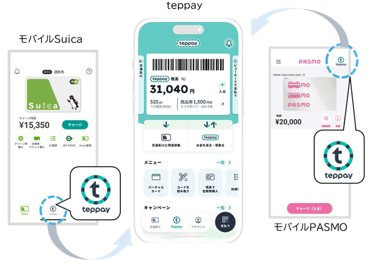 teppayの残高は銀行口座やATM(現金)、ビューカードから入金できるほか、必要に応じてモバイルSuicaやモバイルPASMOの交通系IC残高にチャージすることができる。また、ユーザー同士の残高送付機能を備え、モバイルSuicaとモバイルPASMOの間でも残高を送る・受け取ることが可能になる。