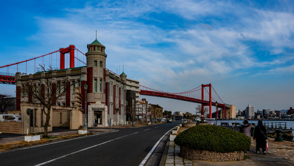 そして、この場所に象徴的な赤い橋梁がある。戸畑区と若松区を結ぶ若戸大橋(わかとおおはし)だ。当初は有料道路であった。しかし、2018年12月に無料化された。1962年9月に開通し、当時「東洋一の夢の吊橋」と言われた。全長2,068m。国の重要文化財に指定されている。