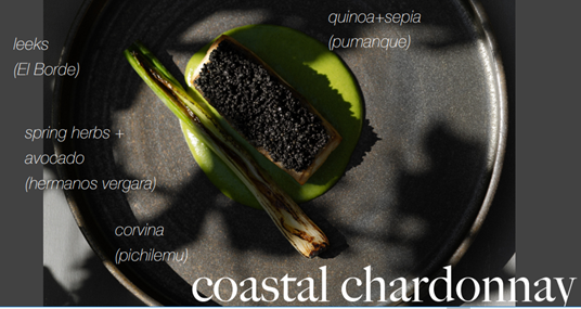 この土地のシャルドネがあります。非常にウッディで重くクリーミーなシャルドネです。これにどのように合わせていくか。コルヴィナ(※筆者注 ニベ科の魚で日本では、シログチ、イシモチ、オオニベなどの呼称あり)の料理です。有機栽培をしている女性から仕入れたネギがあります。これとアボカドでソースを作り、キヌアをイカスミで和え、コルヴィナを調理します。そのためとても柔らくジューシーでシャルドネのクリーミーさとのつながりを生み出しています。