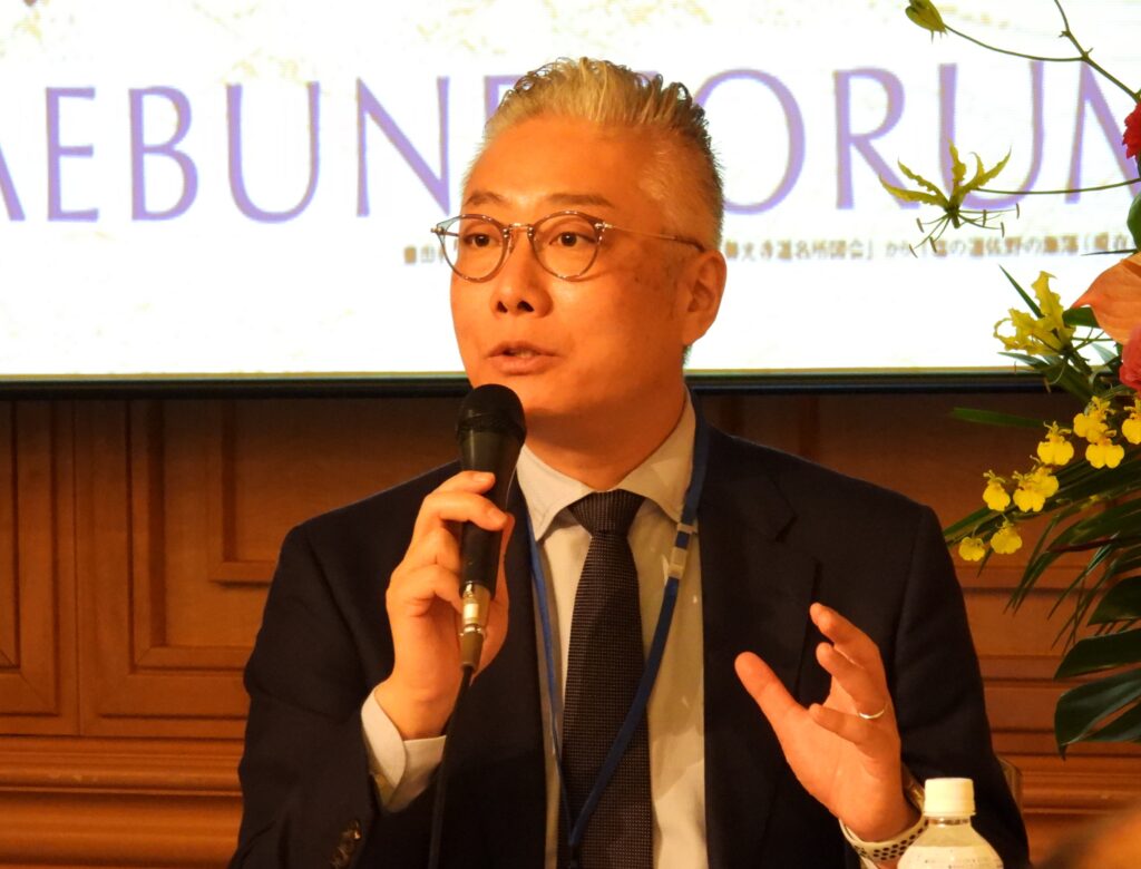 続いて、老舗昆布問屋「奥井海生堂」三代目である奥井隆氏が登壇。北海道の昆布文化が、北前船交易によって越前・若狭・京都・大阪とつながり、各地の料理文化を飛躍的に豊かにした歴史を紹介した。奥井氏は、「昆布は北前船があったからこそ全国に届き、日本料理の味の基礎をつくった」と述べ、食品そのものではなく〝文化の伝播装置〟として昆布を位置付けた。また、海外展開の取り組みについて、「欧州では『うま味』の概念が共有され始め、昆布は単なる食材ではなく『発酵・熟成文化の象徴』として評価されつつある」と説明。さらに、「食を輸出するのではなく、背景にある文化・哲学を伝える努力こそが、日本の食の価値を最大化する」と強調した。