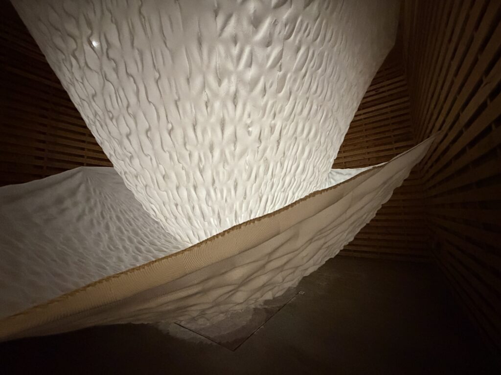 - 増田拓史氏の《白い傘と、白い鳥。》は、富士吉田が戦時中に落下傘用の絹を織っていた歴史に着想を得た映像作品です。美しく嗜好性の高い布を織る技術が、かつて「命を守るための布」を生んでいたという事実を、映像と資料、インスタレーションで多層的に表現しています。