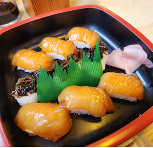 郷土料理の「島寿司」は旬の白身魚などを醤油ベースのたれでヅケにし、甘めのシャリにワサビではなく、カラシを載せて握る。ネタはメダイやトビウオ、岩海苔などが使われる。岩海苔は甘煮になっており、カラシが効く寿司との箸休めに最適な組み合わせだ。今回利用した「あそこ寿司」では、ヅケの島寿司が前日までの予約で楽しめる。