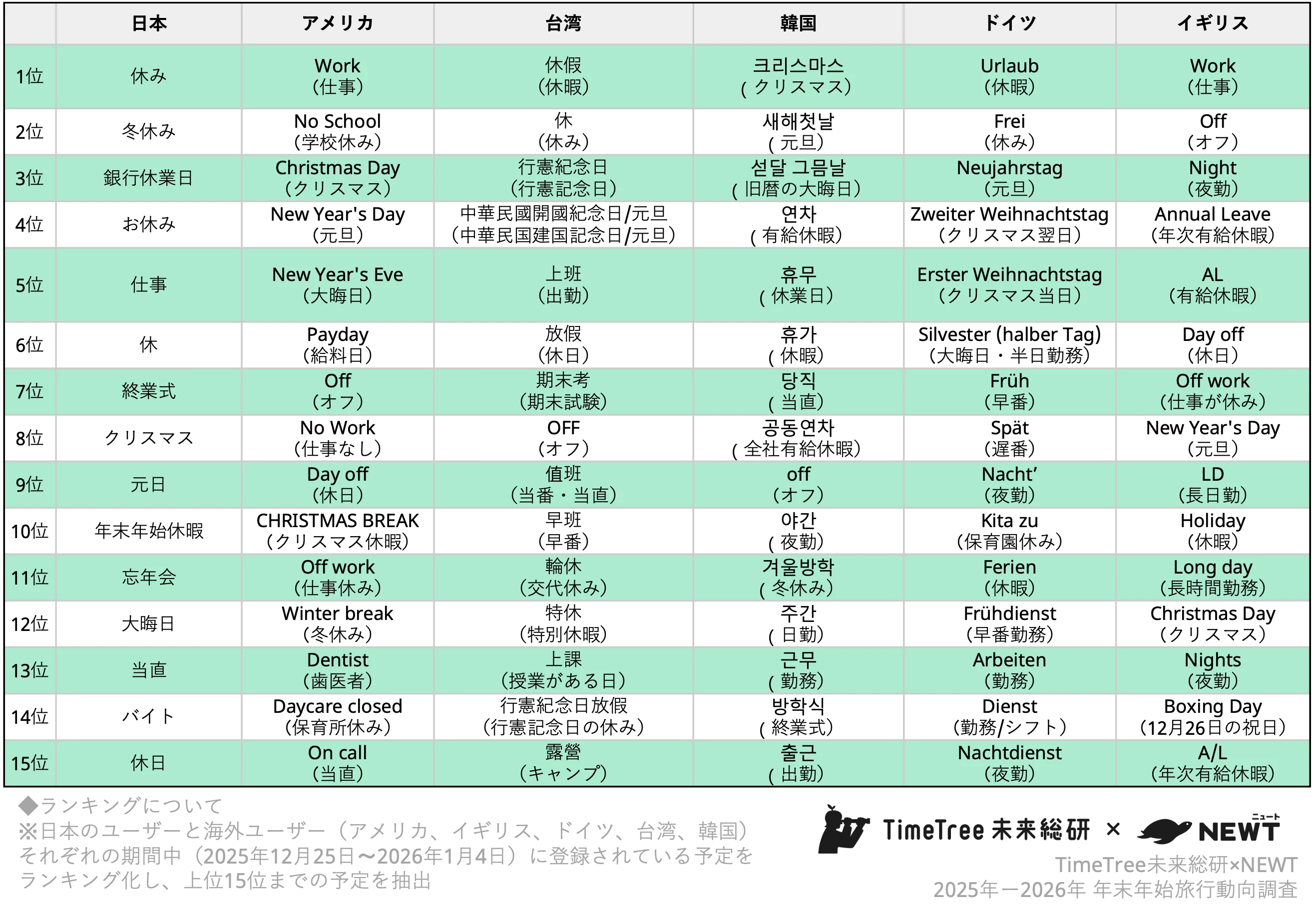 一方、アメリカやイギリスでは「Work(仕事)」が1位となり、年末年始も通常稼働する社会構造が反映された。イギリスでは「Boxing Day(12月26日)」、ドイツでは「Zweiter Weihnachtstag(クリスマス翌日)」といった祝日文化の違いも見られた。台湾や韓国では期末試験や終業式といった教育制度由来の予定が上位に入り、各国の生活文化の差異が鮮明に表れた。