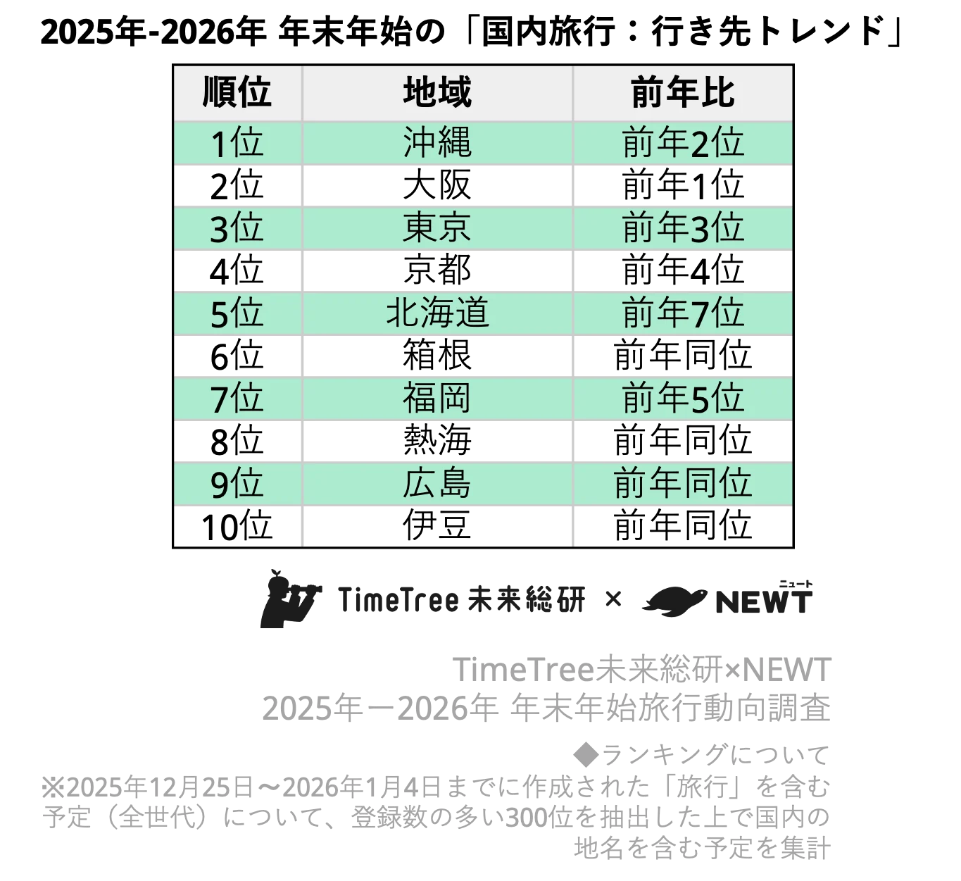 また、北海道は前年7位から5位に浮上。箱根(6位)、熱海(8位)、伊豆(10位)といった温泉地も上位に入り、「遠出を控えつつ、国内でゆったり過ごす」年末年始スタイルの広がりが見て取れる。