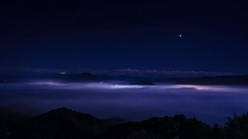 写真②は、盆地からの放射霧が、風向きが変わったことにより、盆地側へと戻ってしまうという「逆流現象」の記録。朝陽が昇ると予想もできない色々な現象が起きるが、これもその一つである。