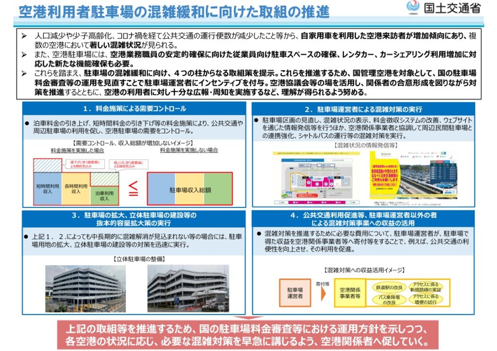 今回示されたのは、国管理空港を対象とした「4つの柱」による総合的な混雑対策だ。国は、駐車場料金に関する審査の新たな運用方針を打ち出し、駐車場運営者に対してインセンティブを付与。各空港の実情に応じた対策を早急に講じるよう関係者に促す。