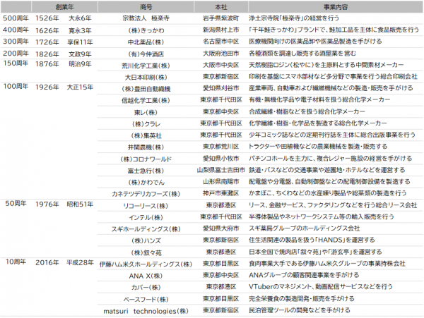 続いて50周年企業の中では、叙々苑やハンズなどが含まれ、10周年企業にはANAグループのANA X(東京都中央区)などが名を連ねた。