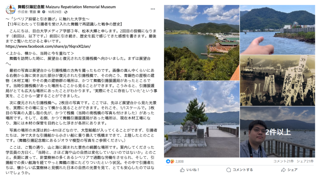 2020年、コロナ禍で休館を余儀なくされたとき、「この場所の記憶を止めてはいけない」「将来の来訪者を蓄積していく場をつくらなければ」という思いで、その危機感と使命感から始められたのがFacebookでした。来館できない時期においても、史実の継承を続けるために、舞鶴引揚記念館は、新たな情報発信活動の一歩を踏み出しました。