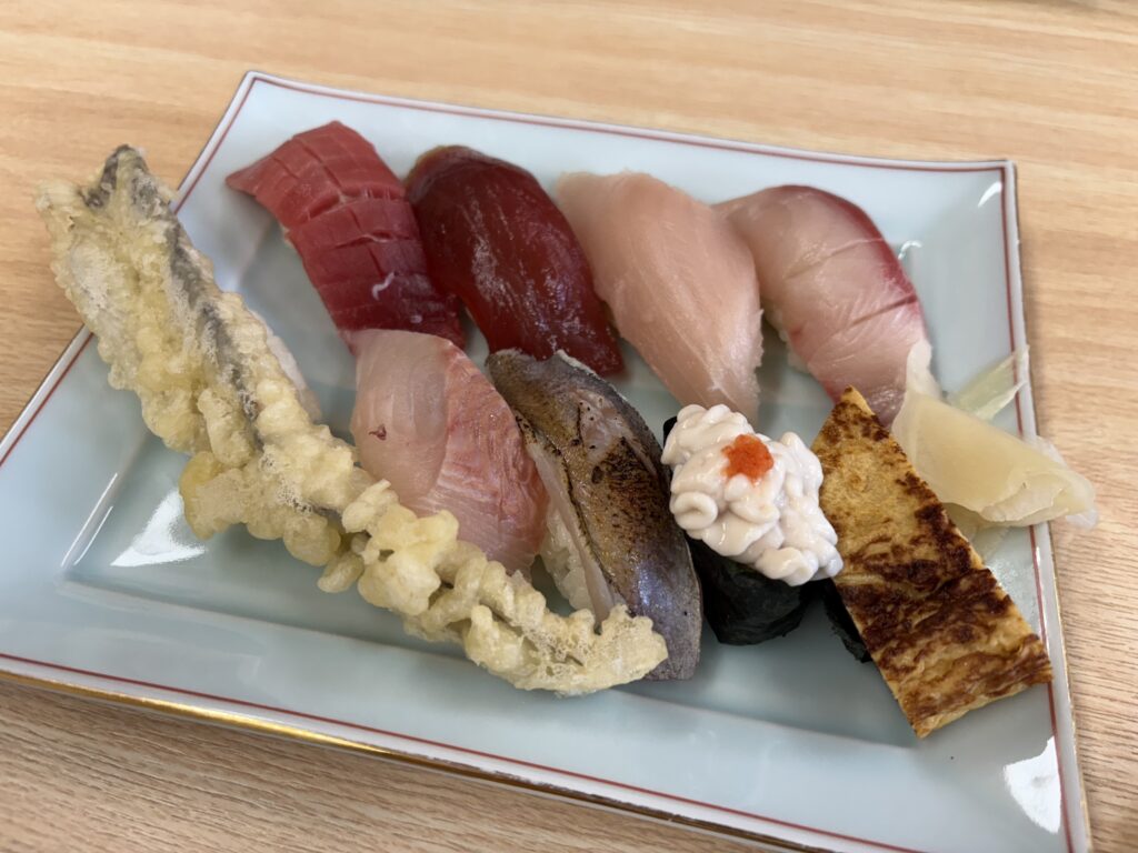 昼食は、老舗寿司店「紀の代(きのだい)」で、地元で水揚げされたまぐろを中心に、白身魚や白子、アナゴの天ぷらなどを織り交ぜたにぎり寿司のコースが提供された。
