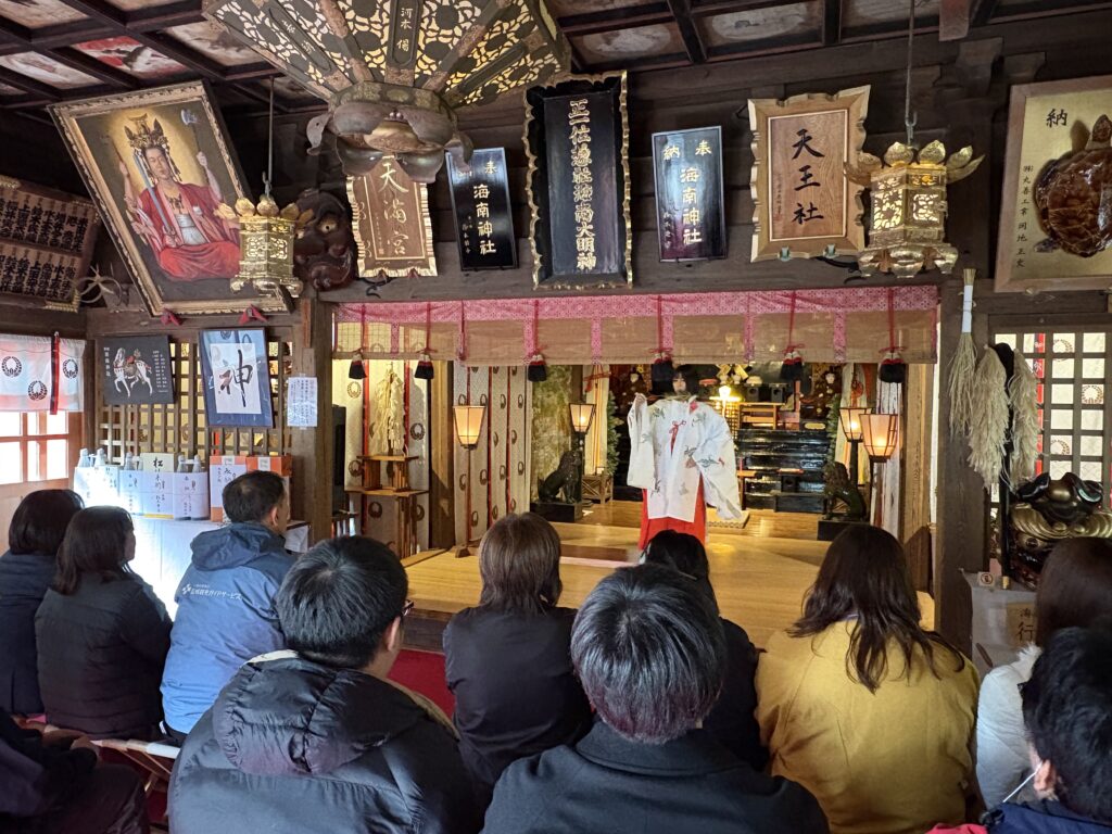 江戸の市場と三崎の港が、海上輸送で密接につながっていた証しであり、昇殿参拝の後、灯楼の由来などが詳しく説明された。休憩時には、ところてんをアレンジしたスイーツが供され、海藻文化が根づく三浦らしい一品として好評を得た。