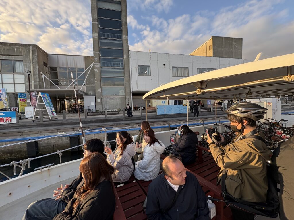 城ヶ島に上陸すると、島内をサイクリングで周遊した。城ヶ島海岸からは、断崖絶壁が続く海岸線の景観を楽むほか、クライマックスとして城ヶ島灯台周辺から夕陽を眺望。水平線に沈む太陽と赤く染まる空と海に、参加者からは感嘆の声が上がった。「食の旅」でありながら、景観体験も含めて五感すべてで三浦を感じられる内容となった。