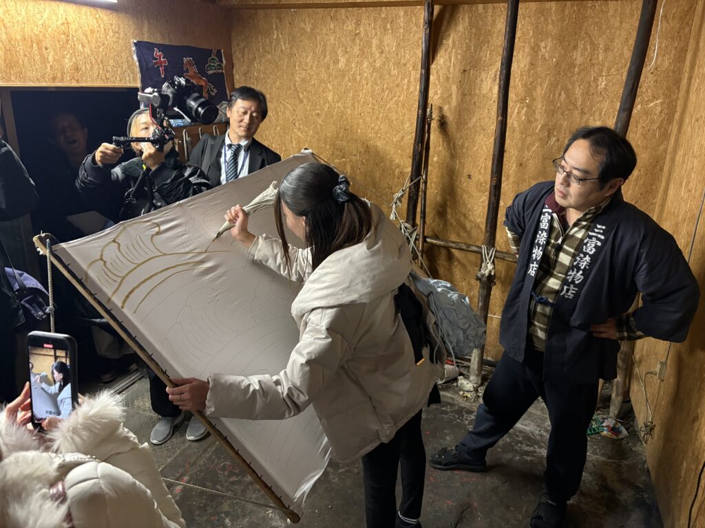夕食後には、老舗の「三冨染物店」で大漁旗の絵付け体験が行われた。漁師の無事と大漁を願って掲げられてきた大漁旗は、三浦の港町を象徴するアイコンだ。これまで一般向けの体験としては行われていない「大漁旗下絵制作体験」を新たな観光コンテンツとしての可能性を試す形で実施。参加者は職人の指導を受けながら、手に下絵制作で使うのりを手にしながら多様な線を描き入れた。