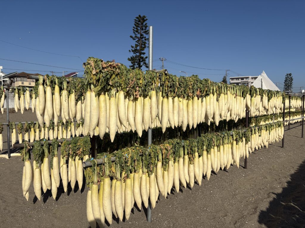 三浦海岸まで足を運ぶと、冬の風物詩である三浦大根の天日干しの光景が広がっていた。浜辺一帯に白い大根が吊るされ、海風に揺れる様子は、沢庵漬けづくりのための工程であり、農漁村の暮らしと気候が密接に結びついていることを物語る。
