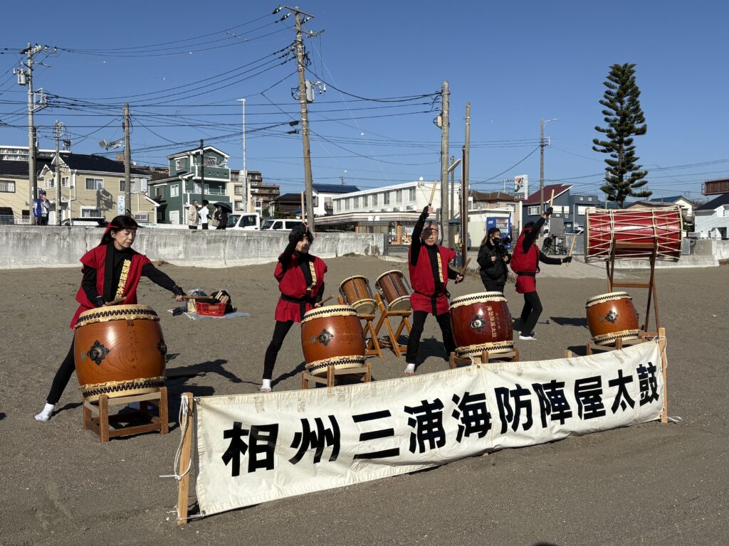 海岸では、海防陣屋太鼓の生演奏も行われるほか、太鼓の担ぎ手から指導を受けて実際に打つ体験をした。波音と太鼓の響きが混ざり合う中で、「今を生きる文化」としての太鼓の魅力が伝えられた。