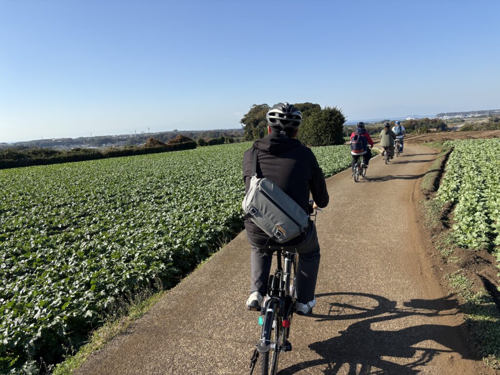 午後は快晴の空の下、参加者はサイクリングで三戸浜方面へと向かった。ペダルを進めると、道の両脇には大根やキャベツなど冬野菜の畑が一面に広がり、海から吹き付ける風が作物を揺らす。視線を上げればすぐ先に海が見え、畑と海がこれほど近接する風景に、参加者は足を緩めながら周囲を見渡した。