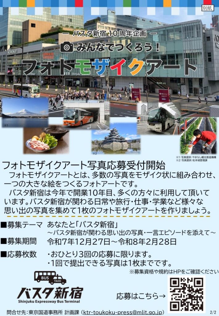 国土交通省関東地方整備局・東京国道事務所はこのほど、2026年に開業10周年を迎える「バスタ新宿」を記念し、利用者から思い出の写真とエピソードを集めて制作する「フォトモザイクアート企画」を開始した。募集期間は2月28日まで。