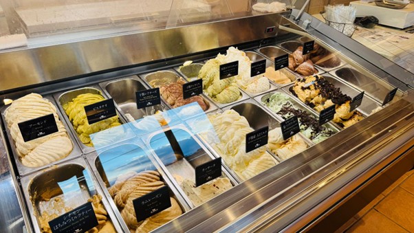 上士幌町役場の方と合流し、まずはオススメの「ドリームドルチェ」さんへ。搾乳後24時間以内の生乳を利用したフレッシュなアイスは、まさに牧場直営ならではの味です!ジェラート3点盛りがお得で美味しい!