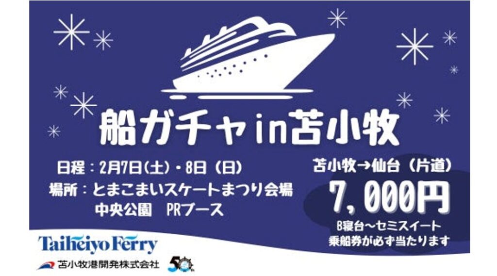 太平洋フェリーは2月7、8日、北海道苫小牧市で開催される「第60回 とまこまいスケートまつり」で、人気企画「船ガチャ」を実施する。名古屋まつりで話題を集めた企画を北海道で初開催するもので、苫小牧―仙台間のフェリー乗船券が必ず当たる。最大で通常運賃3万5,200円相当のセミスイート客室の当選があるなど、船旅を身近に体験できる機会を提供する。