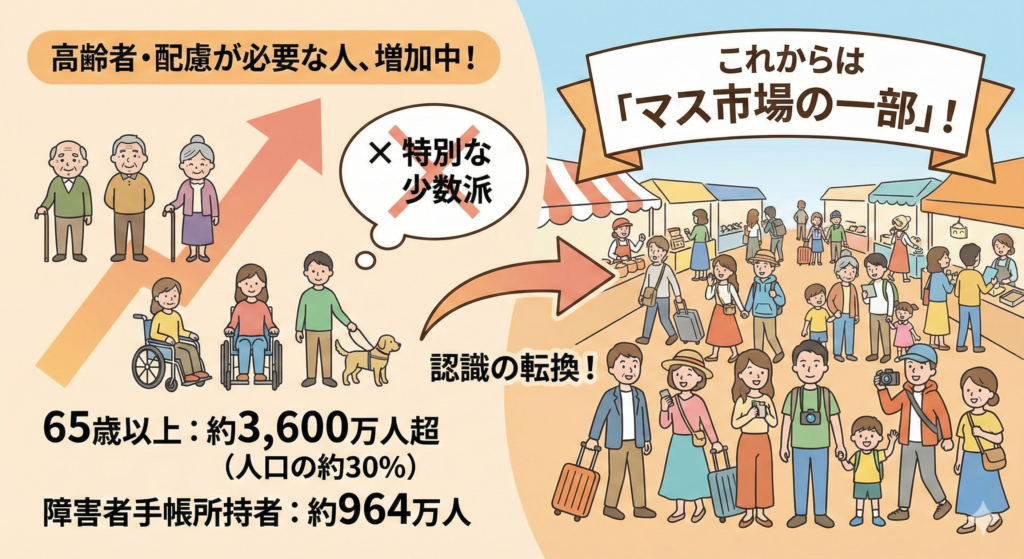 ユニバーサルツーリズムが注目される背景には、単なる社会的包摂の理念だけでなく、極めて実務的な要請がある。