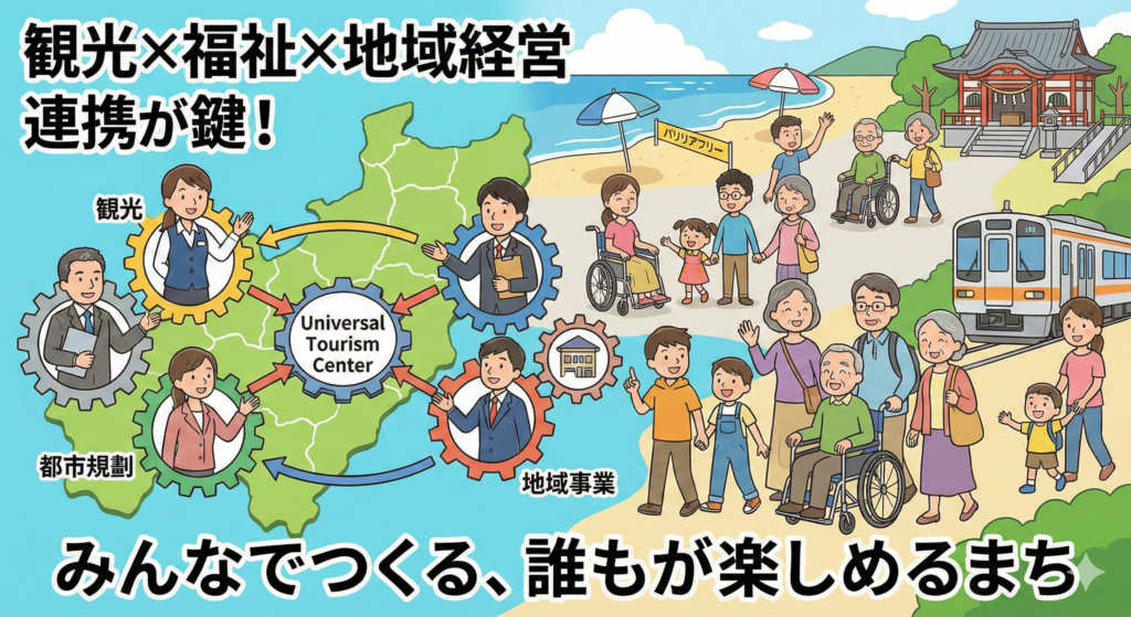 ユニバーサルツーリズムは、福祉部門だけでは推進できない。観光政策・地域経営の中核に位置づけ、複数部署が連携して取り組む必要がある。