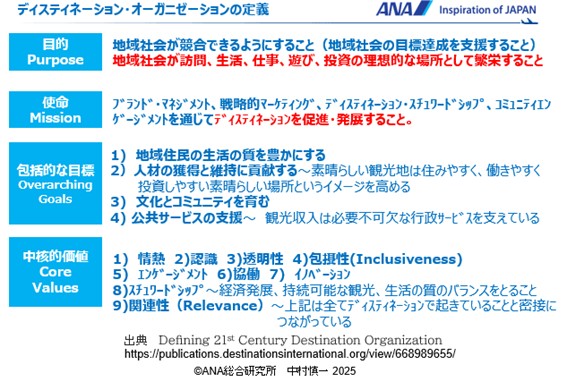 ここで改めて観光地経営を担うディスティネーション・オーガニゼーションとは何かを見ていこう。130年の歴史を経て米国のディスティネーション・オーガニゼーションは進化してきた。当初から期待された来訪者誘致による観光による地域への経済効果は今も昔も重要な項目であるが、さらに重要と考えられているのが、コミュニティ、地域住民の生活の質の向上を目指すことであり、観光が地域にとっての「公共善」たらんとする取り組みである。米国には全米ほか世界39カ国のディスティネーション・オーガニゼーションや調査・研究機関など755組織・1万人以上の専門家が集まるディスティネーション・インターナショナル(DI)という団体がある。調査、分析はもとより、さまざまなツールや階層ごとの教育プログラムも提供している米国のディスティネーション・オーガニゼーションを広く束ねる民間団体であり、筆者の所属するANA総合研究所もそのメンバーである。