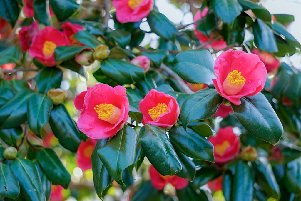 椿の見頃は場所や品種によって異なり、期間を通して島内各地で順次楽しめる。