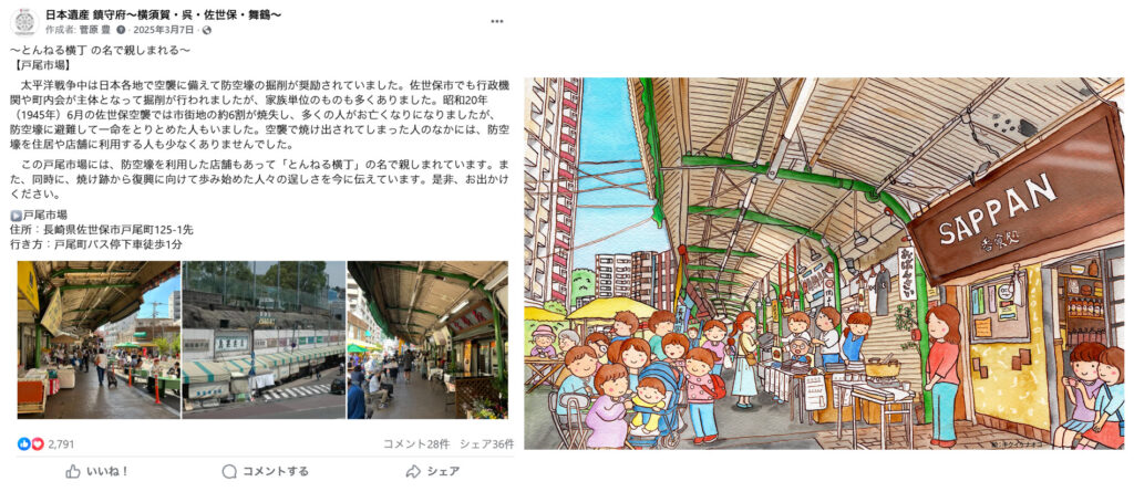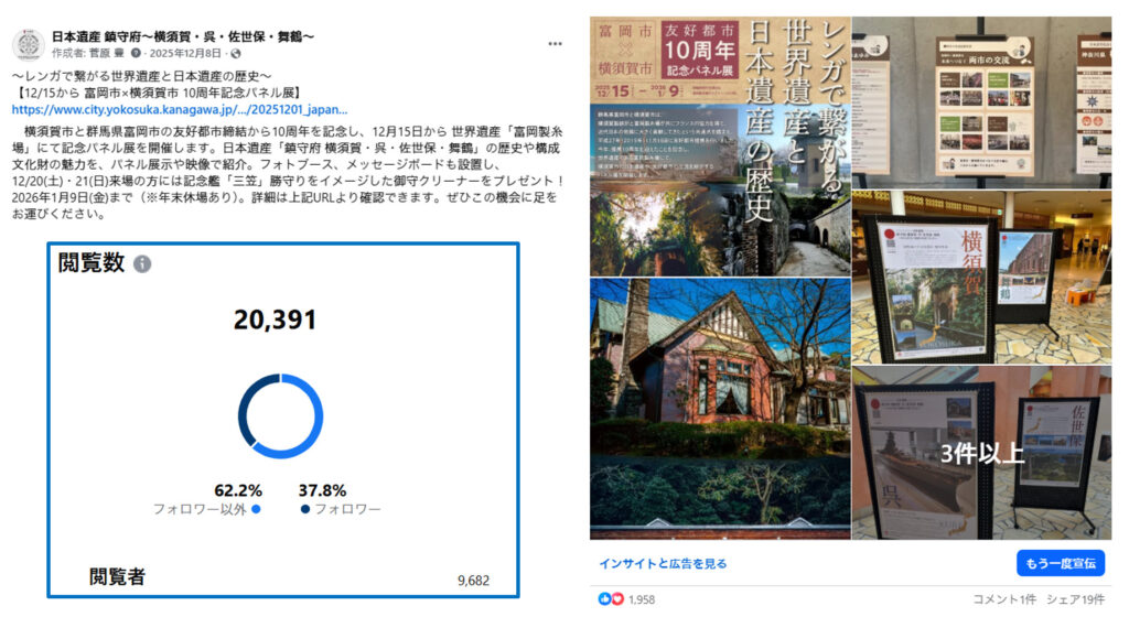 つまり、ユネスコの世界遺産や日本遺産といった、歴史や文化に軸を置くテーマは、「歴史的文脈がある」「一過性ではなく、長い時間軸で語れる」「現地を訪れる動機になりやすい」などの特徴があり、旧軍港4市の日本遺産ストーリーは、まさにFacebook向きの題材だと言えるでしょう。また、日本遺産は、地域型・ネットワーク型を問わず、構成文化財が複数存在するため、SNS上で連載的に発信しやすいコンテンツだということもできます。
