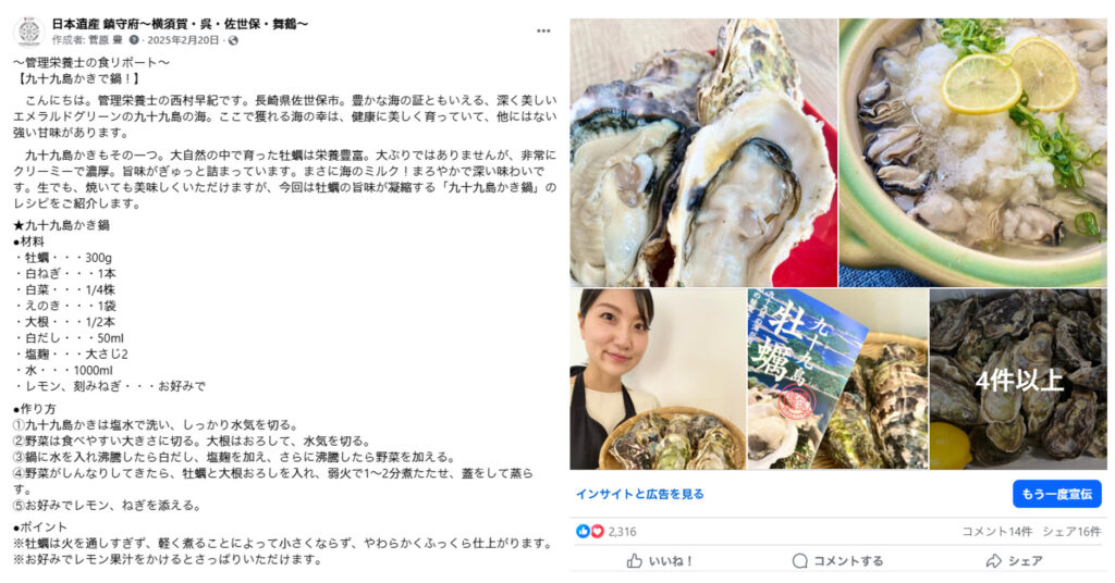 たとえば、佐世保市の「九十九島かき」を取り上げた投稿では、地域食材としての魅力に加え、栄養面や健康面の解説が丁寧に盛り込まれています。書き手は食や栄養の専門知識を有する専門家である管理栄養士ですが、語り口は親しみやすく、「専門知識を持ちながらも、インフルエンサーではなく、“普通の人”」という立ち位置です。